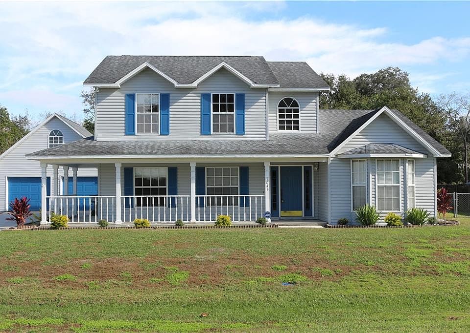 Beautiful 4 Bedroom 3 bath home on almost 2 acres. No deed restrictions. This beautiful traditional looking home features a large porch on front of the house. Open floor plan with vaulted ceilings in family room and formal living room with separate dining room. Full bedroom and bathroom downstairs with master and two other bedrooms upstairs. Covered porch on back of house overlooks large fenced backyard with small outbuilding/shed. Detached garage features an unfinished loft area for additional storage area. This country style home is convenient to I-4 but still has lots of privacy. Lawn care included.