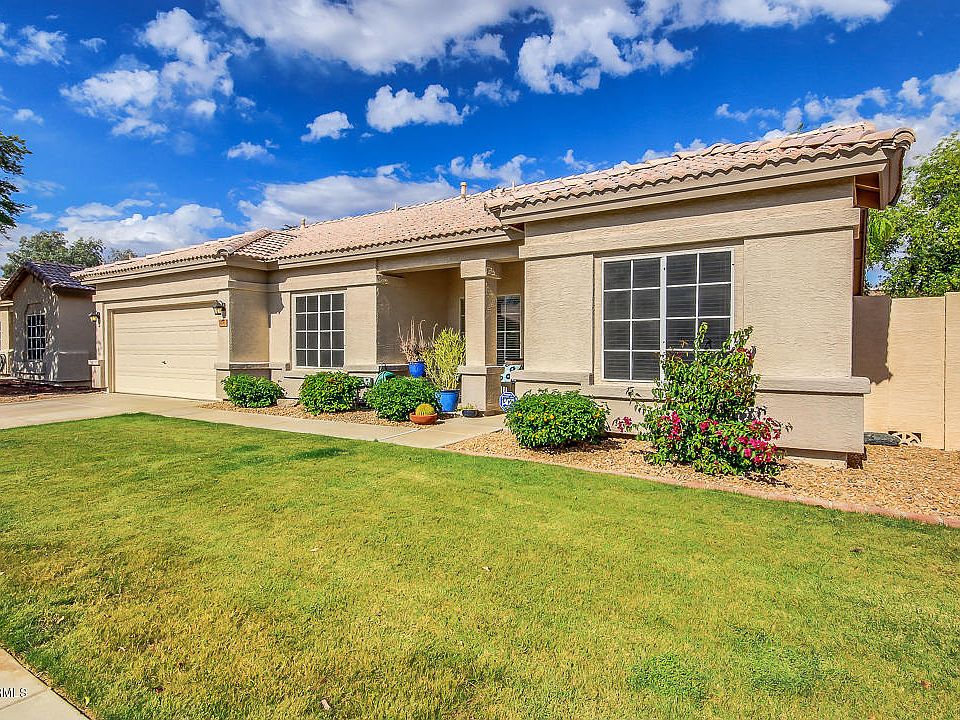 Enchanting 3 bedroom PLUS Den home nestled in the heart of Chandler! Such a spectacular floor plan with great use of space that includes formal living and dining rooms and a great room with cozy gas fireplace. The delightful kitchen opens to the family room and features lots of cabinets, a reach in pantry, stainless steel appliances including a smooth-top stove and built-in microwave. The master suite is large and boasts a beautiful new tile-surround snail shower, double sinks and walk-in closet. You will love the open vaulted ceilings elevations in the living areas, upgraded tile and carpet and over all charm that this home has to offer. Not only is this home fabulous inside but wait until you step out to the backyard to the refreshing and inviting pebble-tech play pool, fenced for safety
