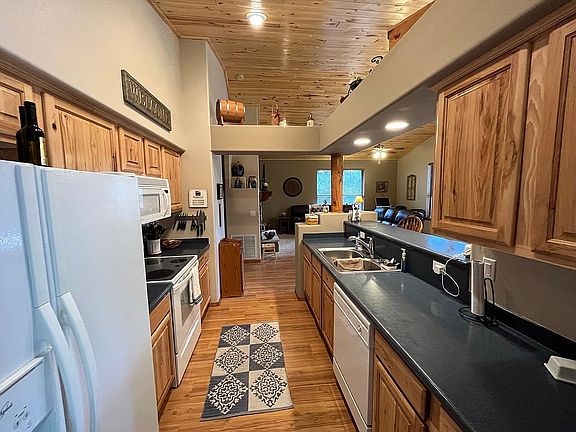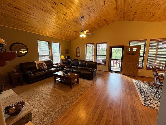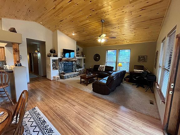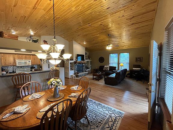 Beautiful cabin in Carnal Landing. Charming front porch rocked front yard and paver driveway. Attached garage. Large family room and dinner room Area. Deck off of primary bedroom. Paver patio with gas fireplace and Rockwall surrounding.