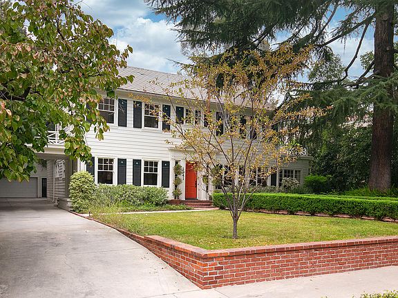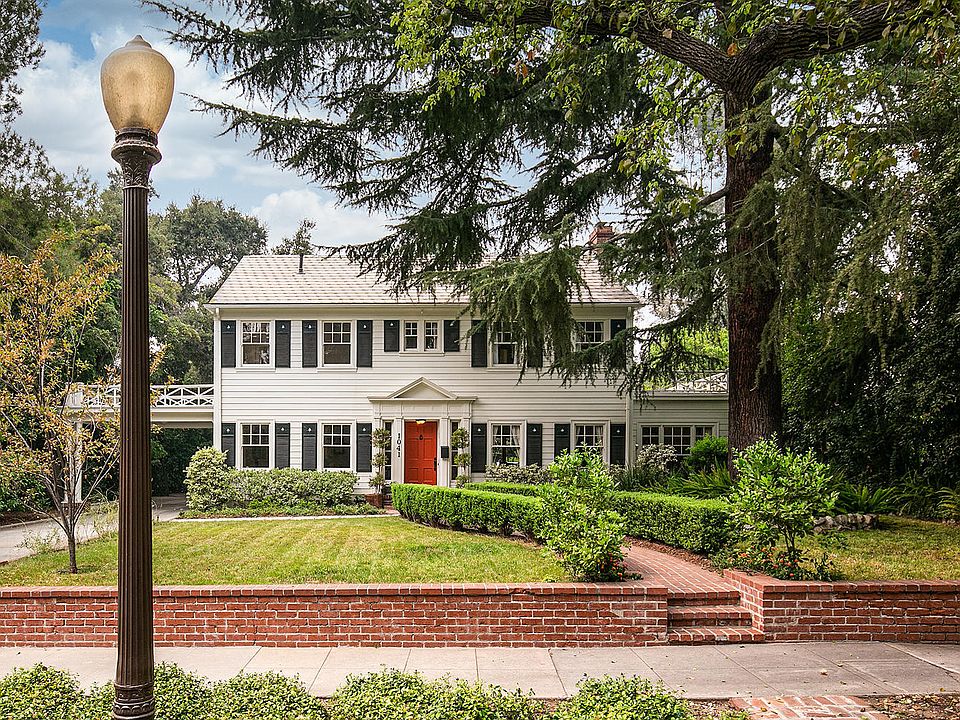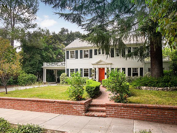Elegance is the hallmark of this picture-perfect Georgian Colonial Revival with shamrock shutters, porte cochère and winding brick-path entry in the historic and highly desirable Prospect Park neighborhood. Formal entry reveals gleaming oak floors, classic center-hall stairway, powder room and access to cozy living room with fireplace, garden views and French doors to the patio. Two spacious home offices offer extensive built-in cabinetry. Formal dining room leads to a charming butler's pantry with mahogany counters, zinc sink, and convenient family desk. The cook's kitchen with Carrera marble counters, professional caliber range and hood, built-in refrigerator opens to both family room and back yard. Fully enclosed by an original brick wall, the back yard and patio are delightful with covered terrace, outdoor kitchen with built-in grill center and concrete counter, in-ground spa, charming fountain, citrus trees and native plantings. Upstairs, the owner's suite offers bath with oversized shower, and walk-in closet. Two additional bedrooms share a bath with beadboard paneling and shower/tub. The garage includes workbench, large storage room and is suitable for a second story addition. Updated systems include modern HVAC, seismic retrofitting, recirculating hot water system, full copper plumbing, water mains, updated wiring, underground 200-amp electrical service, automatic drip irrigation systems. Fireplace to be considered decorative.
