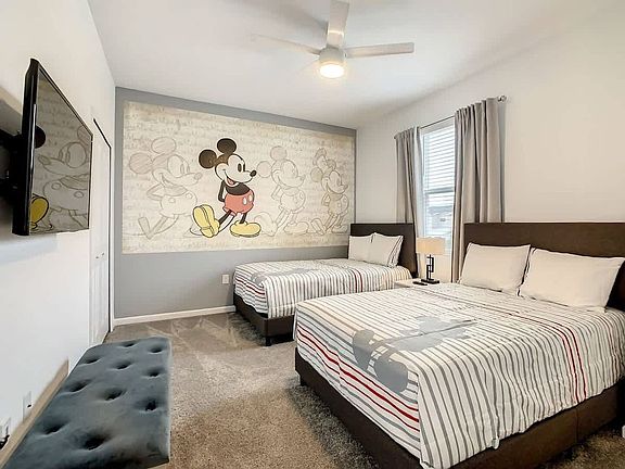 Welcome to your dream Orlando getaway! This Disney-themed townhome in ChampionsGate Resort offers a perfect blend of luxury and convenience. Enjoy a spacious 3-bedroom, 2-bathroom house with a private entrance, a fully equipped kitchen, and resort access. Perfect for families seeking a magical vacation near Disney World! Indulge in the ultimate Orlando vacation experience at this Disney-themed townhome. Escape to the magic of Disney and luxury living at this brand-new, recently remodeled retreat, located in the stunning ChampionsGate Resort. This enchanting home offers the perfect mix of luxury, comfort, and convenience for families, couples, and Disney fans alike. The townhome features 3 spacious bedrooms and 2 bathrooms, sleeping up to 10 guests, a fully equipped kitchen with modern appliances and granite countertops, a spacious living room with a large TV and cozy seating, and a private patio with resort views and breathtaking sunset vistas. Disney-themed bedrooms are filled with magical touches for both kids and adults to enjoy. Additional features include comfortable beds and linens ensuring a restful night's sleep, and free Wi-Fi and cable TV for endless entertainment during your downtime. Guests staying in the ChampionsGate vacation home enjoy full access to all resort amenities. Golf course use comes with an additional fee. To reserve tee times or learn more, contact the concierge team. The Oasis Club offers a luxurious retreat complete with a grand clubhouse, a water park with slides and a lazy river, a quiet pool with private cabanas, and a stylish poolside bar. You'll also find a relaxing day spa, a full fitness center, tennis courts, basketball, and sand volleyball. On-site dining includes a selection of great restaurants and bars. The Oasis Grille Restaurant offers wraps, burgers, fish dishes, daily specials, and more. Additional fees include a late check-out fee of 30%-50% of the nightly rate after 10 AM, an excessive cleaning fee of $100 if the property is left in poor condition, and a damages fee for the cost of repairs or replacement for any damages incurred. Welcome to ChampionsGate, a vibrant and family-friendly neighborhood that puts you in the heart of the action! The townhome is ideally situated for easy access to a variety of attractions and amenities. Just a short drive away, you'll find the magic of Walt Disney World, offering endless entertainment for all ages. For dining, explore the nearby ChampionsGate Village, where you'll discover a diverse selection of restaurants, from casual eateries to upscale dining experiences. You'll also find convenient shopping options, including grocery stores and retail shops, perfect for stocking up on essentials or souvenirs. ChampionsGate also boasts beautiful golf courses for those who enjoy a round of golf. The resort itself provides a tranquil escape with its lush landscaping and serene atmosphere. Whether you're looking for theme park adventures, delicious meals, or a relaxing getaway, ChampionsGate has something for everyone. The resort is minutes away from Disney World, Universal Studios, and SeaWorld. Smoking is strictly prohibited within the townhome and anywhere on the building premises. Violations will incur a charge of $250 to $400 depending on the cleaning company's assessment. Quiet hours are from 11 PM to 7 AM to ensure all guests enjoy peace and rest. Pets are accommodated with exceptions. Check-in time is at 3 PM, and check-out time is at 10 AM. The townhome is designed for a maximum of 10 guests. Exceeding this limit will result in a fee of $100 for each additional guest. Parking is available, but please notify in advance if you require parking arrangements. A towing company patrols the unit every night and will tow cars without permission to park there.