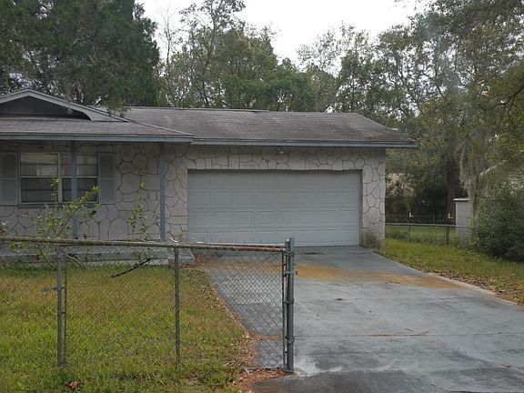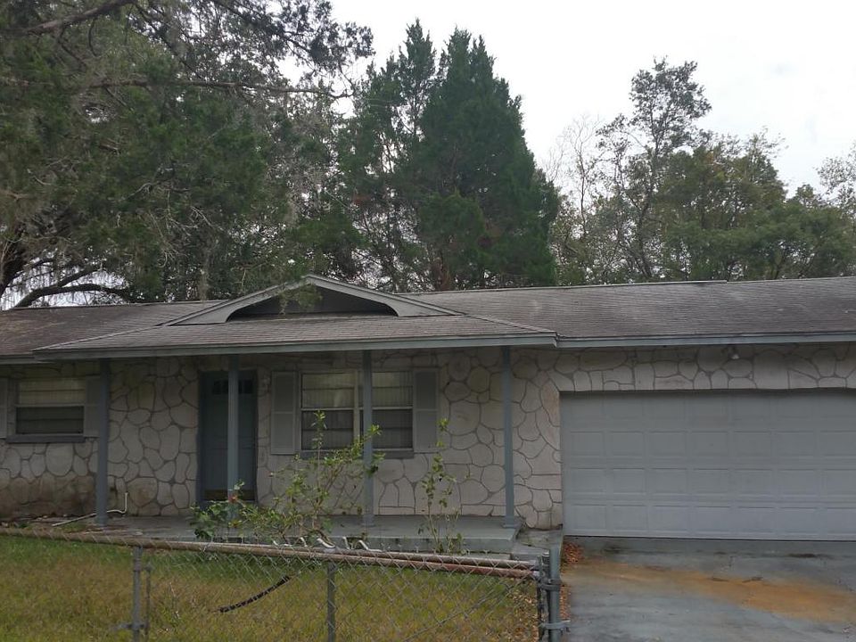 Excellent investment or starter home. 2/2 with large garage. Close to downtown Brooksville. Very peaceful setting with large trees. Has a front fence with gate across driveway for security. Large covered front porch. Large fenced in yard. Newer carpet. Very nice shape. Master bath with step in shower. Tub in other bathroom. Large living room, and den.