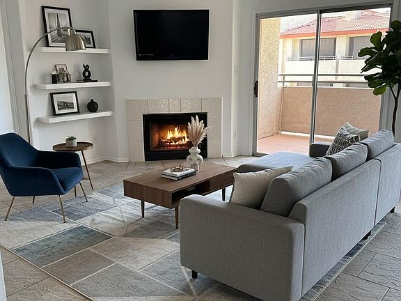 This freshly painted, second-floor unit features a split floor plan with two bedrooms. The primary bedroom includes an en-suite bath and a walk-in closet. The covered balcony, accessible from both the primary bedroom and the living room, offers two ceiling fans. The kitchen provides ample cabinetry, including a five-foot pantry. The entire home features tile flooring and an open floor plan with a cozy fireplace. The owner also replaced the AC unit within the last five years.