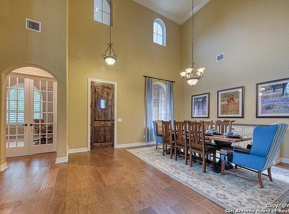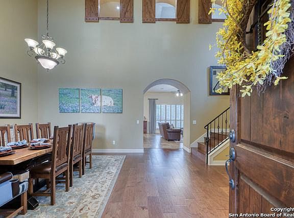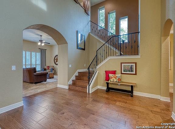 SHOWINGS START FRI, APR 9TH at NOON. Stunning Two-Story Sitterle Home with a Gorgeous Pool in the Gated Community of Triana. Relax in the Backyard Oasis and Enjoy the Custom Pool, Manicured Backyard with Hill Country Views and a Lovely Greenbelt. This Energy Star Certified Home features 4 Bedrooms, 3.5 Baths, Open Floor Plan, High Ceilings, Ceramic Tile, Hand-Scraped Distressed Hickory Hardwood Floors (2018), Plush New Stainmaster Carpet in Upstairs Bedrooms (2020) and a New Roof Replacement (2019). The Gourmet Kitchen includes Stainless Steel Appliances, Hardwood Cabinets with Under Cabinet Lighting, Granite Countertops, Double Ovens, and a Bosch Dishwasher. The Downstairs Master Bedroom is a Spacious Retreat with a Luxury Bath to include a Separate Garden Tub, Walk-In Shower, Double Vanities and Massive Master Closets. The Owners spared no expense in Upgrading this Beautiful Home with an Enclosed Upstairs Game Room complete with Custom Shutters, Snack Bar Cabinet, Microwave, and Wine Fridge perfect for entertaining! Check out the SMART Features in this Home and Top Rated NISD Schools. Neighborhood Amenities include a Pool, Playground, and Pavilion; Easy Access to 1604/IH10 and Close Proximity to Lackland AFB, La Cantera Mall, USAA. Schedule a showing today! This home is a MUST SEE and will go quickly!