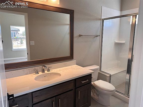 This stunning ranch plan located on a corner lot provides the perfect blend of comfortable living spaces and quality craftsmanship. The main level of this home comes complete with the primary bedroom, junior suite and study. From the moment you walk thru the front door you are pulled into the heart of the home which features a great room with stone to ceiling fireplace and soaring vaulted ceilings. The gourmet kitchen comes complete with solid surface countertops, upgraded stainless appliances and a prep kitchen. The laundry room features a closet, sink and a window. Finishing out the main level is a powder bath and let's not forget about the large deck providing spectacular views of Pikes Peak. The basement comes complete with a large rec room, 2 additional bedrooms, an additional powder bathroom and a jack and Jill bathroom. You will enjoy entertaining family and friends in the spacious rec room which includes a gas fireplace and built-in cabinets. Room sizes should be verified and taxes are based upon the land only.