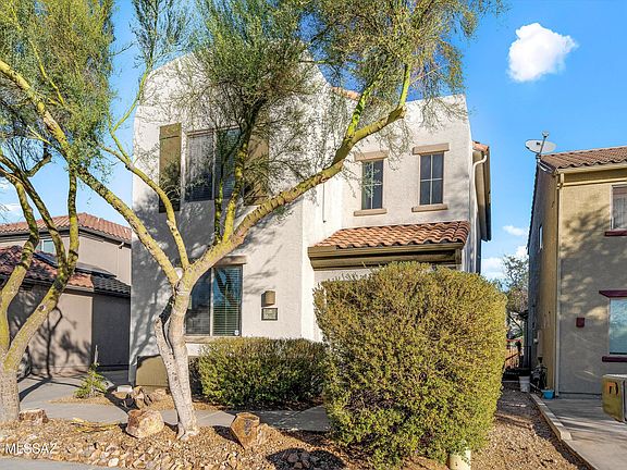 Beautiful 2-story Civano home features a versatile floor plan with a den/bedroom & bath on the 1st floor, perfect for guests or office. 2nd floor includes 2 bedrooms, 2 baths, a laundry room, & loft, offering plenty of space for family living. Enjoy upgrades like tile flooring, maple cabinets, & granite counters, a two-level breakfast bar/sink opens into the great room, which is wired for surround sound and leads to a covered patio with stunning mountain views. The garage is set back from the street, providing additional parking space. The spacious backyard includes a beautiful garden, a fruit tree, artificial turf, lighting, and a wonderful patio. Great community with a park offering grass, play area, and basketball, also has a huge pool, play area, and community (Sierra Morado) center.
