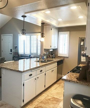 Don't miss out on this gorgeous, completely remodeled upper end unit. With plenty of natural light and privacy, ample parking and no home to either side, this unit is in one of the best locations in the community. This beautiful home features vaulted cathedral ceilings, premium wool carpet and travertine, recessed lighting, scraped ceilings, plantation shutters, fresh paint and new baseboards throughout. The upgraded kitchen features new stainless steel appliances, breakfast bar, granite countertops, and designer light fixtures. Large master suite has lots of lights and two separate mirrored door closets. The renovated master bath has double sink vanity, and a beautiful travertine shower. Control the central air conditioning and heat from your smart phone with Nest. Brand new air conditioning and water heater, indoor laundry, two car garage with brand new door, travertine fireplace, and two large balconies are just a few more of the many features this home offers! The highly desirable Greenbrier Terrace is a gated community with 4 pools and spas. Easy access to dining, shopping, and freeways. This home will not last!