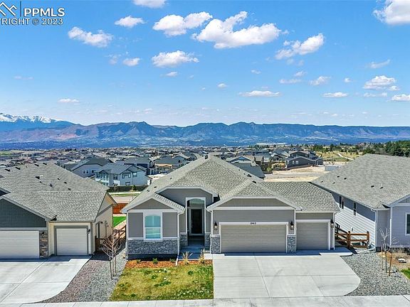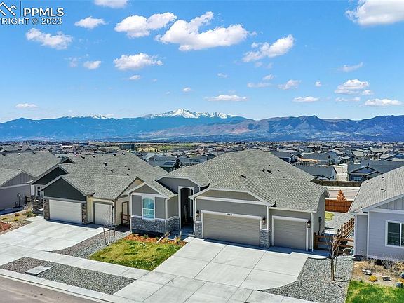 Stunning home with unobstructed views of Pikes Peak & Front Range! Covered porch leads direct into spacious entryway featuring 12 ft ceilings. Located off the entryway is bedroom/office adorned with vaulted ceiling, gorgeous arched window with plantation shutters overlooking front yard and adjoining full bathroom with raised vanity featuring granite counters, under-mount sink, and tub/shower combo. New re-designed CUSTOM kitchen features 8x5 island with bar seating, pendant lighting, luxe quartz counters, built-in oven and microwave, dovetail joint white cabinets, gas range with custom hood, cabinets with pull out drawers, built-in spice racks, under-mount composite sink. Adjoining the kitchen is dining area, which also features custom lighting and flows immediately into newly updated hearth room that has new and additional windows to take advantage of the sweeping views from the Spanish peaks all the way to Mount Hermon. The lower casement windows allow for fresh air without the elements of rain entering the home. Gorgeous great room with trey ceiling and new custom 8 foot sliding glass doors that lead to the covered patio. Master bedroom adorned with plantation shutters, views of Pikes Peak & the AFA, and an attached 5 piece bath with a raised vanity to include granite counters, double sinks, a deep soaking tub, a shower with a mosaic tile in lay, plus walk-in closet. The basement family room features a media area includes surround-sound system, garden level windows, bump out perfect for an area to play games, unfinished storage room, and walks out onto a 9x14 concrete patio with more gorgeous views. One basement bedroom is a junior suite and has an attached full bathroom and walk-in closet. Two other secondary bedrooms feature spacious closets & share an adjoining full bathroom. Many features about this home include no rear neighbors, A/C, fully finished garage, & more! MUST SEE property! Amazing Location. Too many custom features to list!