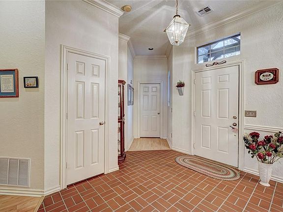 3 bed plus study that could easily be a 4th bedroom. Crown molding, mostly solid surface floors for cleaning and ease. Beautiful tray ceiling in master along with an incredible Australian closet, double vanities and separate tub/shower, great floor plan and clean as can be. Wonderful neighborhood, covered patio, Storm Shelter in the garage and the hot tub will remain.