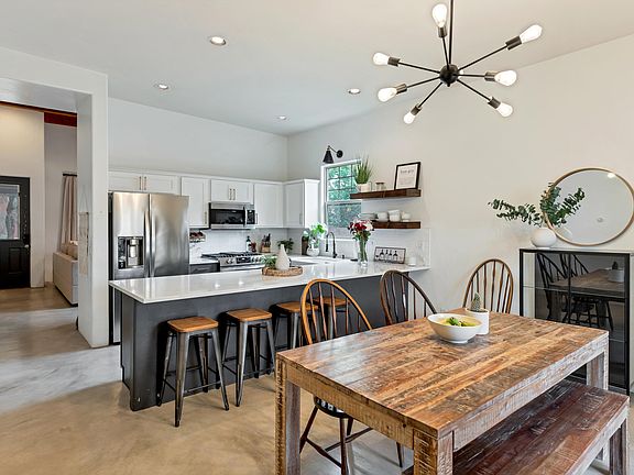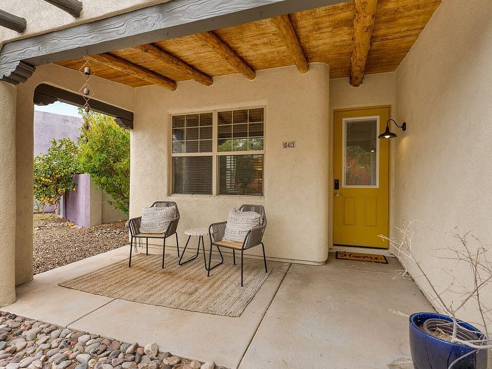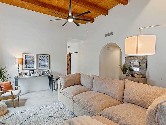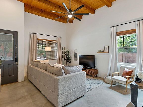 Stunning 3 bed / 2 bath Santa Fe style home in the beautiful Civano Community. As you step inside, you're greeted by a meticulously remodeled interior, with sleek concrete floors accentuated by lofty high ceilings adorned with rustic beams. The remodeled kitchen stands as the centerpiece, featuring a spacious island, pantry, and a generously sized dining area that flows into the backyard creating an inviting space for indoor-outdoor gatherings. Enjoy and relax in your elegant ensuite bedroom, with its spacious walk-in closet and luxurious ensuite bathroom. This home has a newer AC system, water heater, and updated appliances. The front door has been freshly painted and upgraded with new glass, and for added security and convenience, a Ring doorbell has been installed. The house's exterior received a fresh coat of paint in February 2024, and the roof was recoated in 2023, ensuring a vibrant and well-maintained façade. Step outside to your private oasis with a cozy patio and backyard, complete with a safe and enclosed pet run.