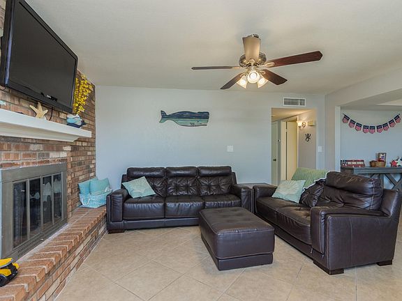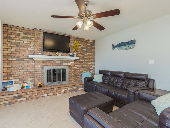 Lovely neighborhood gem. Walk through the doors to find tiled floors and a grand living area, illuminated by brick fireplace. The kitchen, overlooking a more intimate family area, offers stainless steel appliances, lovely tiled backsplash, granite countertops, and a breakfast bar. The master bedroom is spacious and cozy and has a connected bath with stunning tiled shower. The backyard has lots of grass area as well as a covered patio and luscious trees. Insulated windows and just painted inside and outside.