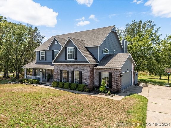 This beautiful, updated farmhouse style home sits on a serene, wooded one acre lot m/l in the charming Stone Bridge Estates neighborhood in the desirable Owasso school district. Many recent updates including new paint inside and out, new flooring and hardware. Featuring a cozy living room, formal dining, and second living area that could be used as an office, den, or hobby space. The large utility room allows plenty of space for an additional office or flex area. The open kitchen is centrally located in the heart of the home, overlooking a bay window breakfast area and the main living space. This home boasts a large primary suite with reading nook. Separate soaking tub and shower in the primary bath. 3 additional bedrooms and a full bath upstairs. Backing to a lush greenbelt, property includes dog run and fire-pit. Plenty of space for your boat, trailer or RV.