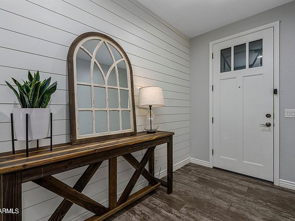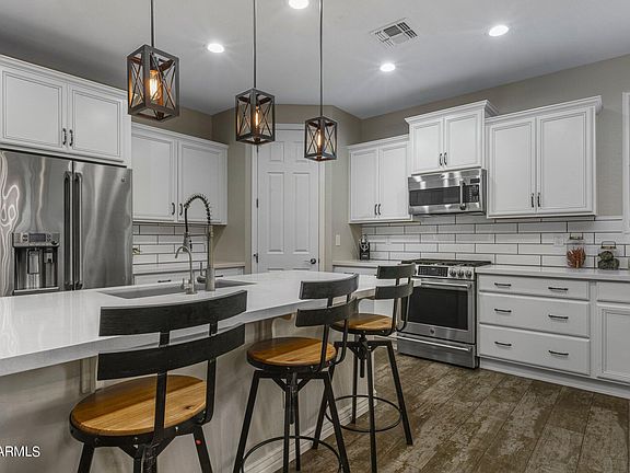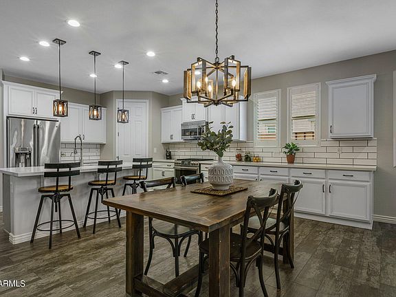 Welcome to your beautiful highly upgraded home in the award-winning community of Eastmark. This gorgeous single-level home includes plantation shutters throughout, staggered maple dovetail cabinets with soft close drawers, thick quartz kitchen countertops, gourmet gas top stove, high-end wood plank tile flooring, custom upgraded lighting, sliding barn door to hallway, shiplap in two hallways and board and batten in the third hallway, spacious walk in shower with rain glass, solid core doors at all bedrooms, built-in exterior customizable holiday trimlights, pavers on front driveway and walkup, custom finish built-in garage cabinets, epoxy finished garage flooring, insulated garage including door, salt-free water softener, 7 stage RO system, gates to backyard on each side of house, security door and security system. Your backyard features green low maintenance turf, covered extended patio with pavers, two raised garden beds, and fruit bearing lemon and blood orange trees and grape vines. The highly acclaimed Eastmark community provides a large community center with a wide variety of games and entertainment, a heated community pool, community farm, numerous parks, a chef run farm to table diner, elementary school and two of the nation's top-ranked charter schools, all within the Eastmark community. Welcome home!