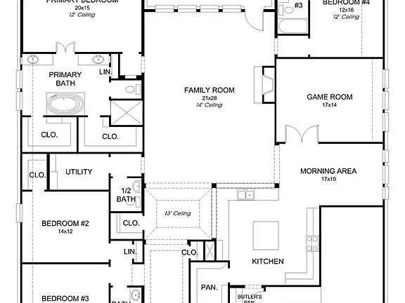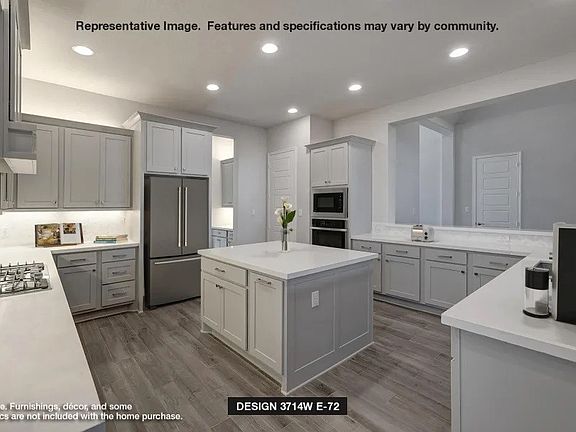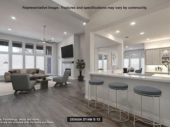 Home office with French doors and dining room frame entry with 13-foot coffered ceiling. Hardwood floors throughout living areas. Family room with a wood mantel fireplace, wall of windows and 14-foot ceiling. Kitchen features island, large walk-in pantry, double wall oven, 5-burner gas cooktop and butler's pantry. Game room with French doors just off the morning area. Spacious primary suite. Freestanding tub, separate glass-enclosed shower, dual vanities and two walk-in closets in the primary bath. Guest suite with full bath and walk-in closet. Abundant closet and storage space. Extended covered backyard patio with 14-foot ceiling. Three-car garage.