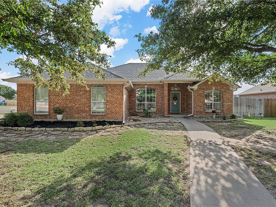 Check out this corner lot cutie with a versatile formal dining area that can easily transform into an office or a second living space! This home features elegant vinyl flooring throughout, providing a seamless and modern look. The inviting living area includes a cozy fireplace, perfect for creating warm memories with family and friends. The kitchen is equipped with granite countertops, stainless steel appliances, and ample cabinet space for all your cooking essentials. The primary suite is a true retreat, offering a spacious sitting area, dual sinks, separate tub and shower, and a generous walk-in closet. The additional bedrooms are well-sized, providing comfort and flexibility for your family or guests. Step outside and you'll find a large covered patio area, ideal for entertaining or enjoying quiet evenings. Schedule your showing today, this one won't last long!