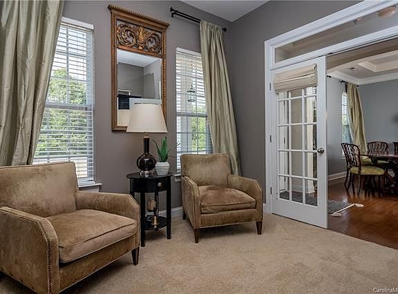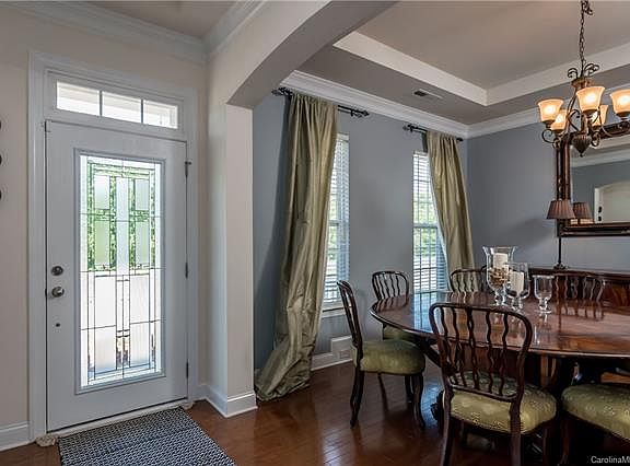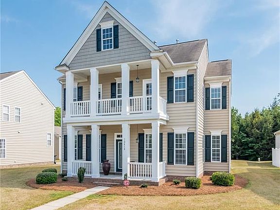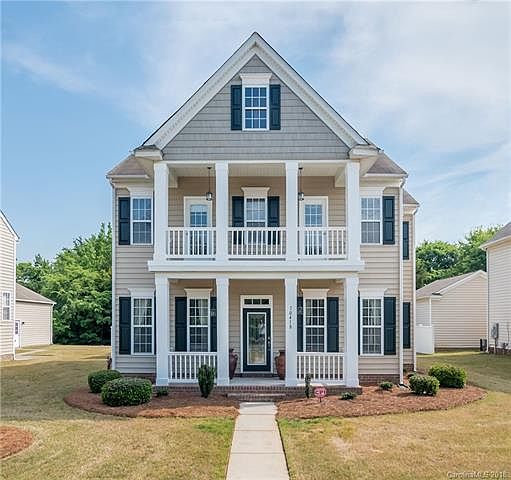 Lovely Home with Double Front Porch, 10' Ceilings, Close to I-485, Shopping, Restaurants, Churches & Schools! Gleaming Hardwood Floors, Trey Ceilings & 2-piece Crown Molding, French Glass Doors into Living Room/Office. Good Sized Family Room w/Ceiling Fan, Gas Fireplace w/Granite Surround. Kitchen w/Hardwood Floors, 42" Raised Panel Glazed Front Cabinets, Solid Surface, Tile Backsplash, Stainless Steel Appliances, Gas Range, Breakfast Bar & Separate Breakfast Area. 2" Blinds throughout. Powder Room w/HW (Excludes Mirror), French Door to Rear patio & 2-Car Detached Garage. Wood Tread Stairs w/Wrought Iron Spindles to 2nd Floor, Huge MBR w/Deep Octagonal Trey Ceiling, Fan, Tiled Master Bath w/Acrylic Block Windows over Garden Tub & Separate Shower. Both Secondary BRs have French Doors to Front Balcony + Jack & Jill Bath. One Year 2-10 Home Warranty Included! HOA Fees Includes Lawn Maintenance, Pool, Clubhouse, Playground & Walking Trails!