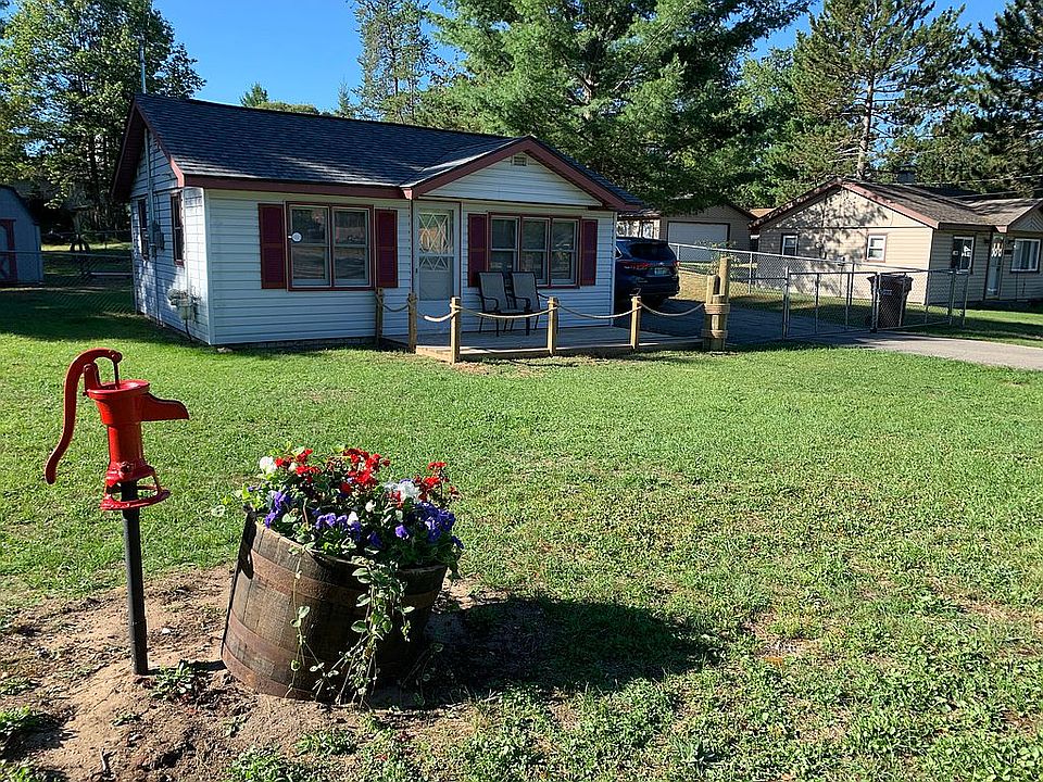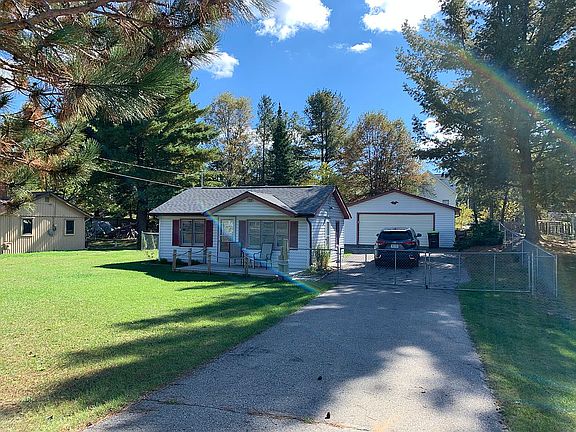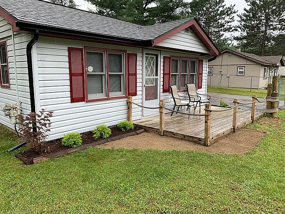 1 bedroom, 1 full bath cabin. Can be converted to a 2 bedroom very easily. Newer wood/vinyl thermopane windows. 2 year old fridge. Vinyl siding. Roof for cabin and garage replaced in 2021. Free standing garage 24’x32’ with opener.