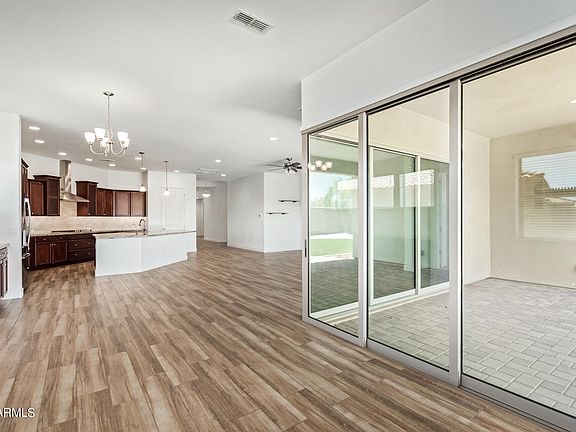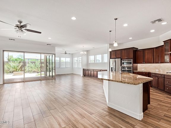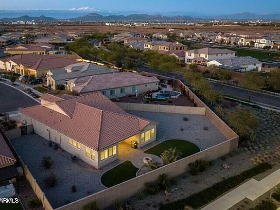Gorgeous home in Eastmark! Beautiful curb appeal highlighted by stone accents, 3 car tandem garage, paver driveway, and a lovely front yard w/artificial turf. Discover a desirable open floorplan with a very large greatroom & dining areas, tons of natural light, wood-look tile flooring, and stacked sliding doors to the backyard. The gourmet kitchen boasts granite counters, stylish backsplash, staggered cabinets, a pantry, buffet cabinet, and an island w/breakfast bar. Primary bedroom offers a lavish ensuite with dual sinks, separate tub/shower, & a walk-in closet. Secondary ensuite bedroom has soft carpet, plantation shutters, & a full bathroom. Enjoy the extra large/spacious backyard with synthetic lawn, a fire pit, & paver-covered open patios