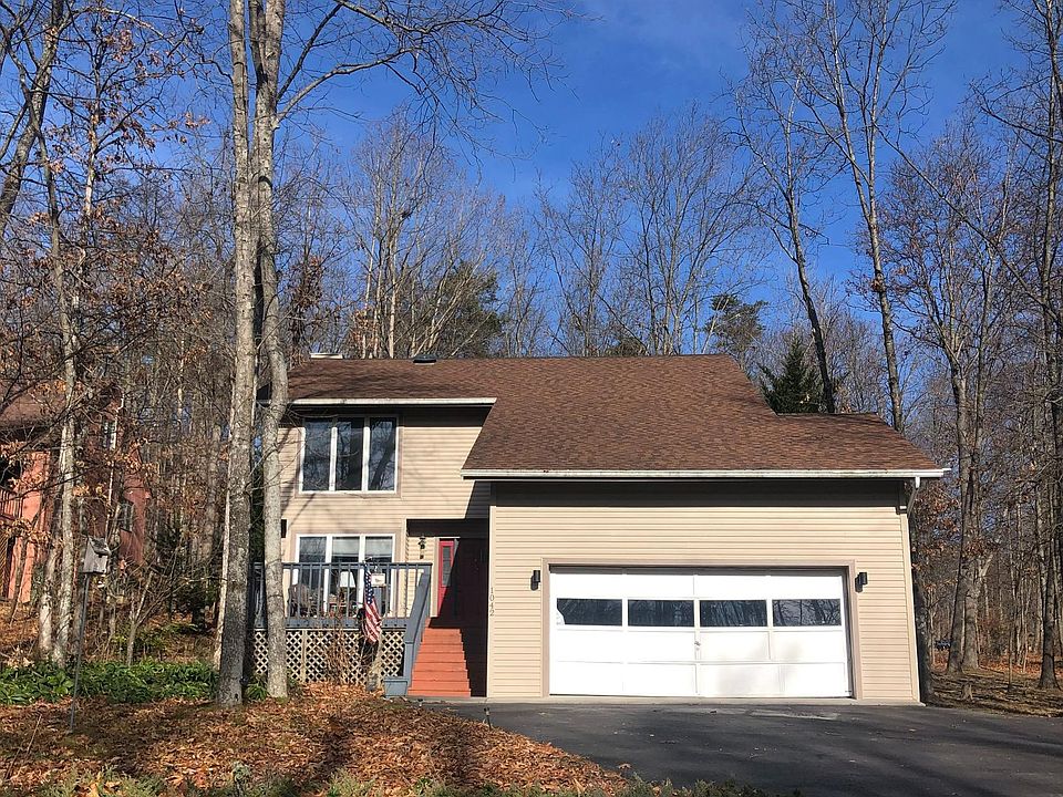 Perfect Lake Living!! This beautiful home, with lake views, is literally just a couple minutes walk from the main beach, playground, tennis courts, club house, basketball court and marina. At home, enjoy the privacy of a deck and patio off the main living space with a lovely, private wooded view. There is a second deck off the primary bedroom for morning coffee, private reflection or simply enjoying nature. The main level features a large kitchen with tiled countertops and plenty of cabinets; a family room with 2 sliding glass doors that let in loads of natural light plus a woodburning fireplace; separate dining space; a half bath and the laundry area. Also on the main floor is a flexspace room with a good sized closet that could be an office, a bedroom (door would need to be installed), music room, den or playroom. Upstairs you have a primary bedroom with a walk in closet, primary bath with separate sinks and a sliding glass door to the private deck. The second upstairs bedroom is huge! There is an additional third bedroom and hall bathroom. The two car garage is large enough to accommodate a boat and also has a workshop area. So much to love about the floorplan of this home, the lot and the stupendous location for full enjoyment of all that Lake Holiday has to offer.