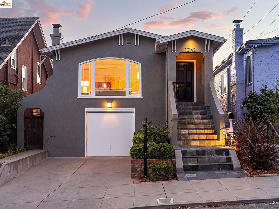 Nestled in Albany's coveted Terrace Park neighborhood, this 3-bed, 2-bath craftsman bungalow offers elegant living near Marin Elementary School, BART, parks, and Gilman and Solano Ave. shops and restaurants. Craftsmanship shines from the slate tile stairwell to the formal living room with an expansive east-facing window, inviting ample natural light. A black slate fireplace and arched entryway lead to a spacious formal dining room. Two bedrooms and a tastefully tiled bathroom lie down the main hallway, one with attic access. The bright kitchen boasts white cabinetry, Corian countertops, and custom tile flooring extending into the rear stairwell. Descending, find a primary suite with high ceilings, a small log fireplace, walk-in closet, and a custom-tiled en-suite bathroom. The ground level wows with two-story ceilings and floor-to-ceiling windows opening to the tranquil rear garden, featuring a deck and travertine tile patio—an ideal retreat. The lower level offers a versatile 442 sq.ft. space with 7ft. ceilings, windows, and access to the garage. Refinished hardwood floors, period windows, and moldings add character. The basement houses laundry and storage. This Albany gem offers timeless charm, modern amenities, and a prime location—a rare find.