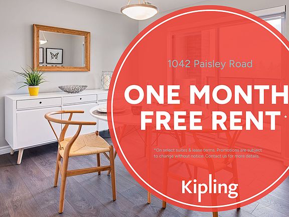 AboutReceive 1 Month Free Rent!*Welcome to 1042 Paisley Rd, part of the Paisley Square rental community in Guelph's sought-after west end. This modern mid-rise building offers comfortable, contemporary living close to parks, schools, shopping, and major routes like Imperial Rd S and Highway 6.Residents enjoy bright open-concept layouts, in-suite laundry, stainless steel appliances, and private balconies in select suites. The property provides elevator access, secured entry, and on-site parking for convenience and peace of mind.Live minutes from Costco, Zehrs, LCBO, and West End Community Centre, everything you need is right at your doorstep. Discover the ideal blend of comfort and convenience at 1042 Paisley Rd.*1bdrm ONLY, Promotions are subject to change without notice. Contact us for more details. Offer for new residents only