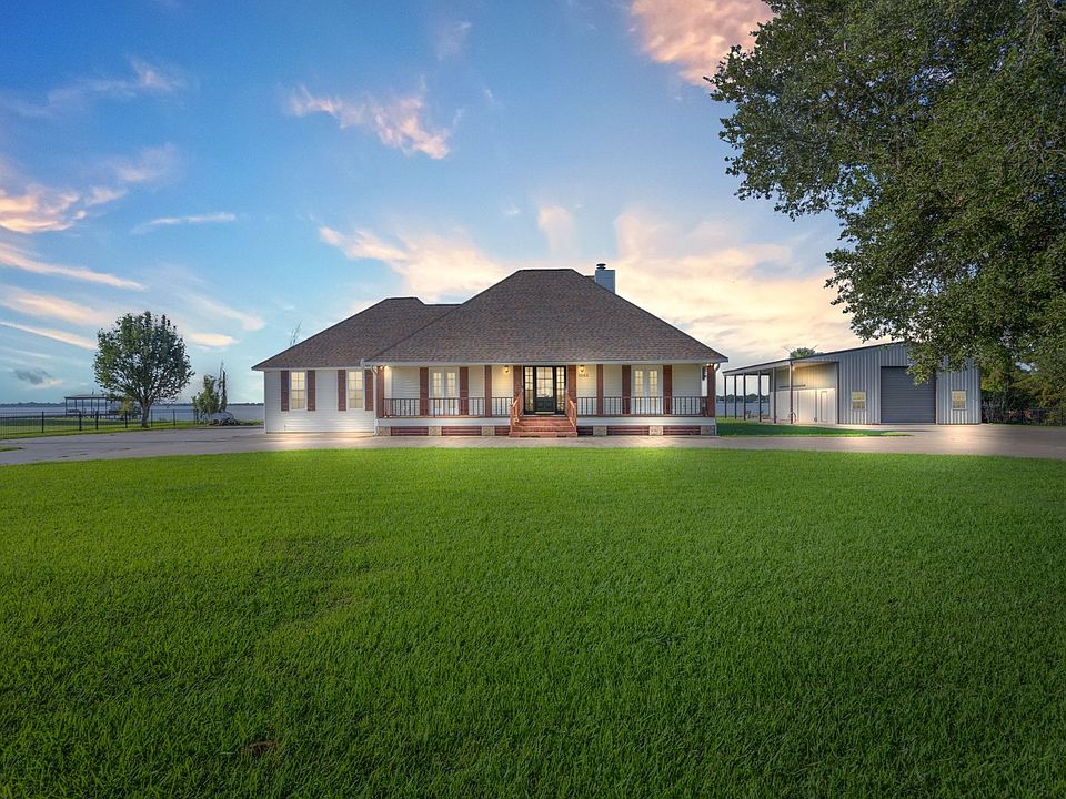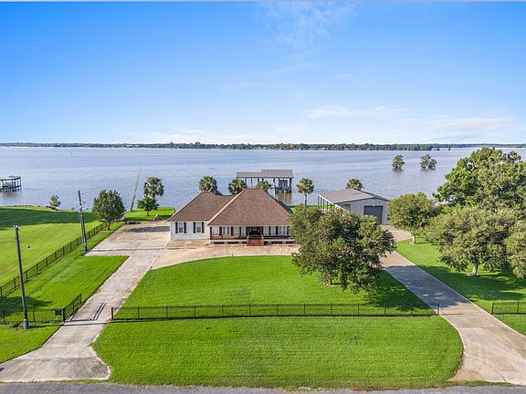 Waterfront living at its finest! This beautiful 3-bedroom, 2.5-bath home offers 190 feet of prime waterfront with a galvanized bulkhead, private pier, and covered boat dock. The spacious open floor plan, approximately 2238 sq ft, features warm wood floors, vaulted ceilings, and stunning views from nearly every room. The kitchen is designed for both function and charm with custom cabinetry, large island seating, and gas cooking. Recent upgrades include a 4-year-old roof and a brand-new AC system with a 10-year transferrable warranty, giving you peace of mind for years to come. The oversized metal shop provides endless storage for boats, RVs, or hobbies. Relax or entertain on the back porch, where sunsets over the water make every evening special. AND, only a 5 minute boat ride to salt water fishing!! With the right offer, this home can come fully furnished, making it an easy move-in or a ready-to-go lake retreat. Don't miss your chance to own this exceptional waterfront property! (All measurements are more or less)