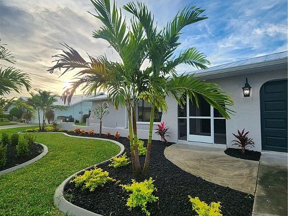 **MAJOR PRICE REDUCTION** Time to take advantage of this wonderful opportunity. The owner has just lower the price and would love to have an offer. The lush, new landscaping greets you as you arrive at this beautiful tropical oasis. This home has been completely renovated and offers a split 3 Bedroom/2 Bath floor plan, with wonderful views of intersecting canals. The Kitchen has been totally updated with new appliances, countertops (soft close drawers), cabinets, lighting and tile floors. The Living Room and Dining Area have new LVP flooring and the entire home has been freshly painted. Both the Master and Guest Bathrooms have new vanities (soft touch drawers) and toilets as well as newly tiled showers and flooring. The home also features a separate in-home laundry room with storage and a new free standing washtub. New lighting and new ceiling fans (some with remotes) have been installed throughout the home. The freshly, re-screened lanai also has new fans/lighting (with remotes). The New Metal Roof and a new air handler were installed in 2023. Not only do the intersecting canals provide a spectacular view, they also offer one bridge access to open water. The two car garage features an automatic door opener and new electric service circuit box. Lastly, all external lighting has been tastefully updated. There is plenty of room to add a pool and extend the lanai, if you desire.