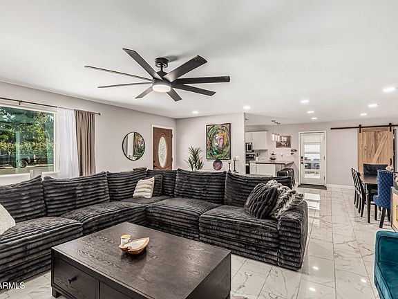 Interior features marble tile & wood floors, recessed lighting, brick fireplace, barn doors, and French doors to a backyard oasis with green grass, shade trees, fire pit, RV gate, covered patio & paver areas.