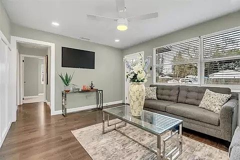 Open stylish interiorFresh paintNew roofQuartz countertopsBrand-new deckNew carpetsCeiling fans