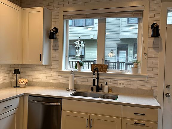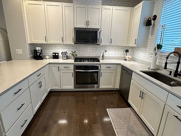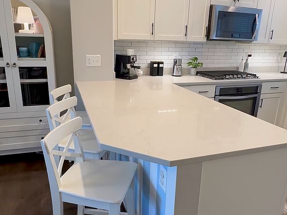 - quartz countertop and stainless steel appliances in kitchen, along with 3 white barstools included