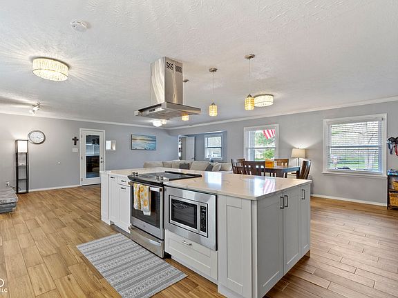 OVER AN ACRE IN CARMEL. Remodeled "dream kitchen" features a 10x4 quartz countertop island, cooktop range/oven with built in air fryer, new microwave and island hood exhaust fan. GREAT ROOM 32X24 creates a modern "Open Plan" and the cheerful space you desire. 6 foot French door from kitchen leads to a paver stone patio with firepit for your private backyard escape. A cedar trellis, accented by LED lights, provides an amazing atmosphere. Recently painted exterior brick refashions this classic range style home. Bonus room currently used as an extended pantry could also serve as office. Updated bathrooms with self-close shower doors. Ceramic "wood grain" tile in the main living spaces. Deep Oversized 2- car garage with epoxy floors, work area, and service door. Great curb appeal. no HOA . City water but also has a well for extra watering.