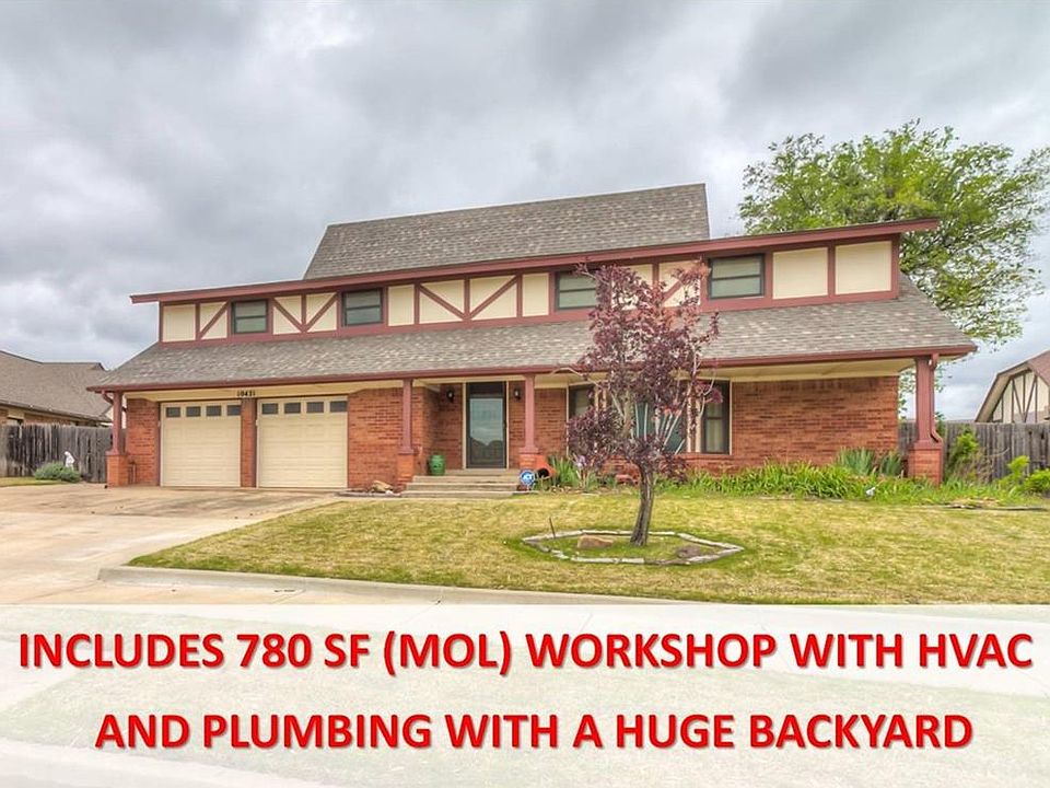 A CHARMING HOME WITH A HUGE WORKSHOP & AN AMAZINGLY LARGE BACKYARD IN OKC! This lovely home features 4 BEDS PLUS STUDY, 3.1 BATHS, 2658 SF, 2 PRIMARY BEDROOMS, 2 LIVING, 2 DINING, 2.5 YEAR OLD HVAC, MASSIVE WORKSHOP & A STORAGE SHED in the backyard! This will surely satisfy all your creativity in home improvement projects & ideas! The 780 SF MOL Workshop Garage has its own HVAC & plumbing, huge attic space over the top which includes a versa lift & is just a perfect area for hobbies, projects, auto repair, wood working or other DIY projects. First level has 2 spacious living areas w/wet bar & fireplace, kitchen w/built-in appliances & plenty of storage cabinets, breakfast nook & the primary bed w/full bath. Second level has the other 3 large rooms, 2 full baths & the study. The wonderful backyard w/its covered patio is ideal for cookout or BBQ nights w/your family & friends! Home is minutes away from major highways, hospitals, dining, shopping & entertainment! Welcome Home!