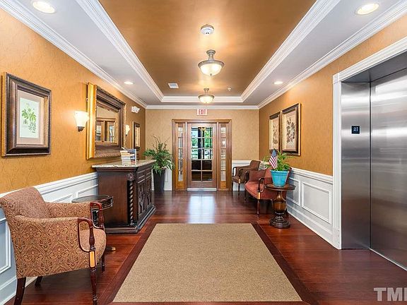 Stunning lake and sunset views from this 2 bd / 2 ba third floor condo in popular Brier Creek, complete with a screened-in balcony, chef's kitchen, and tons of community amenities! A security entrance and elevator take you to the unit, where you’re greeted with wood floors, natural light, and an open layout. Cook in the kitchen with granite countertops, tile backsplash, ample cabinet space, and recessed/pendant lighting, then choose to dine at the bar counter, in the informal dining space, or in the formal dining room, complete with crown molding, wainscoting, decorative columns, and an elegant chandelier! Flow into the carpeted living room ahead to gather around the gas log fireplace and watch your favorite movies under the vaulted ceiling. Sliding glass doors lead out to the screened and covered balcony - the perfect spot for views of the lake, gazebo, and million dollar sunsets! When it’s time to wind down, choose from either of the two generously sized bedrooms, each featuring a walk-in closet. The primary includes an ensuite bath, equipped with a dual sink vanity, tiled glass door walk-in shower, and garden tub, while the secondary has access to the hallway bath, containing a tiled glass door shower! Central A/C and Forced Air heating. One car garage. Community amenities include a clubhouse, with banquet facilities, a members-only dining room, fitness center, locker rooms, steam rooms, and massage/spa center; a swimming area, with pools, a waterside, and kid-friendly Splash Zone; and four tennis courts! https://www.briercreekcc.com/ Located near shopping, dining, and entertainment, with easy access to I-540, hwy 70, and RDU Airport! Buyer should verify all information.