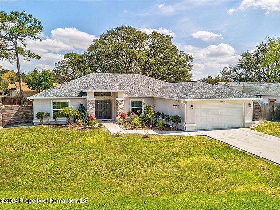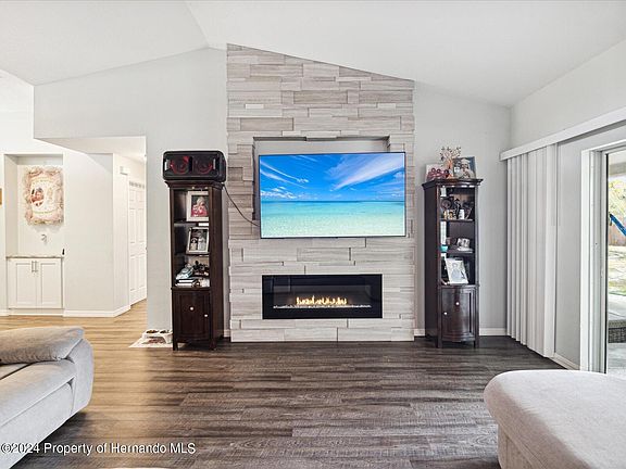 Welcome to this stunning 4-bedroom, 2-bathroom home built in 2017. As you approach, you'll notice its elegant facade featuring stone pillars and French doors leading into the entrance. Inside, the home exudes modern charm with neutral tones throughout. Luxury vinyl flooring graces the living spaces, while plush carpeting adds comfort to the bedrooms. The living room is a focal point with an electric fireplace and modern light fixtures that illuminate the space. The heart of the home, the kitchen, is a delight, featuring brown fantasy granite countertops, stainless steel appliances, and ample cabinet space. LED recessed lighting brightens the room, complementing the energy-efficient insulated windows that invite natural light indoors while keeping cost low. The main suite offers an oversized layout and a wraparound vanity in the ensuite bathroom with dual sinks, perfect for relaxation and pampering. The exterior boasts a stone fire pit in the yard, an extended lanai, and a fully fenced yard for privacy and outdoor enjoyment. Whether entertaining guests or enjoying quiet evenings at home, this residence offers both luxury and functionality in a timeless setting. Conveniently situated in a desirable location with easy access to amenities. Whether it's shopping, dining, parks, or schools, everything you need is just moments away. Schedule your showing today!