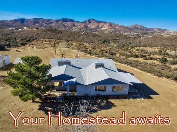 360 degree views of the Bradshaw and Mingus Mtn ranges at this top-of-the-world horse ranch: 26.44 acres of privacy, serenity, views & opportunity! The main house is 4100 sq ft of brick solid, well built, split floorplan, single-level living w spacious living areas, massive master suite, huge kitchen & more! *ALL NEW: paint, light fixtures, a/c & heat, water heater, septic, well pump, weather treated roof & floors throughout. Imagine your future here and make it exactly how you'd like! The large detached garage/workshop is perfect for work or hobby. The well house has room for additional storage. There is also a 3 horse stall with plenty of space for an arena! This property is bursting with potential. Come and make your dream horse property come true! Additional 33 acre attached optional!