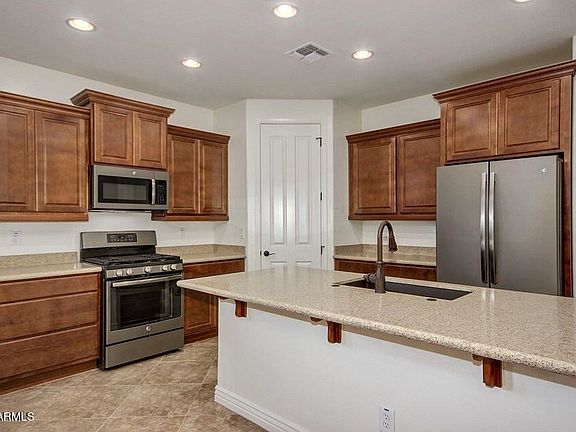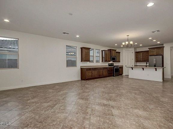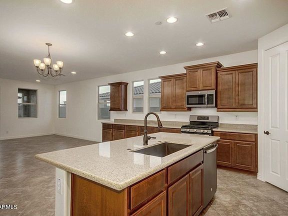 This spacious, single-family home in Eastmark, features both modern amenities and architectural character in a fantastic location. Open concept living at it's best in this three bedroom, three bath home, plus a den/office/fourth bedroom. The kitchen offers Quartz countertops, Maple soft close cabinets, an island, gas range/oven, walk-in pantry, breakfast bar, and dining area. The family room is light and bright and looks out into the lovely backyard featuring a covered patio with pavers, beautiful faux lawn, another seating area for entertaining and is easily maintained. Master bedroom is large and includes a beautiful walk-in shower, double sinks, and a walk-in closet. Tile in all the right areas with carpet in the bedrooms. Ceiling fans throughout. Hurry, call today!