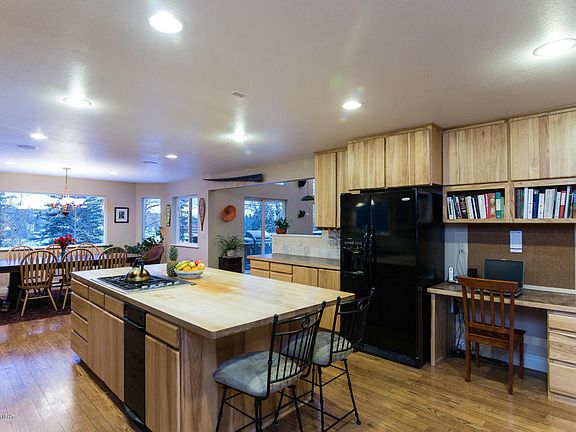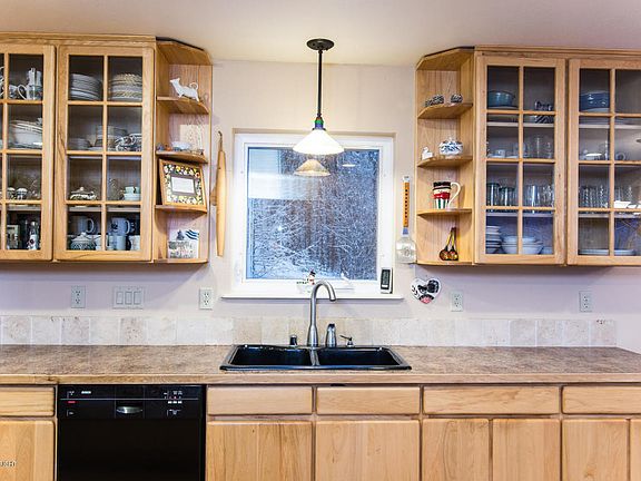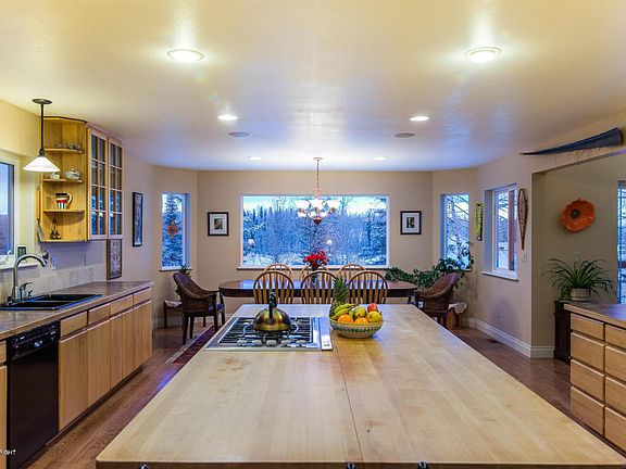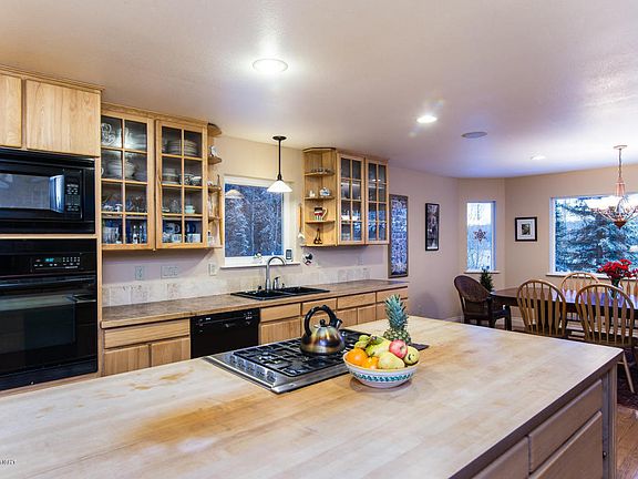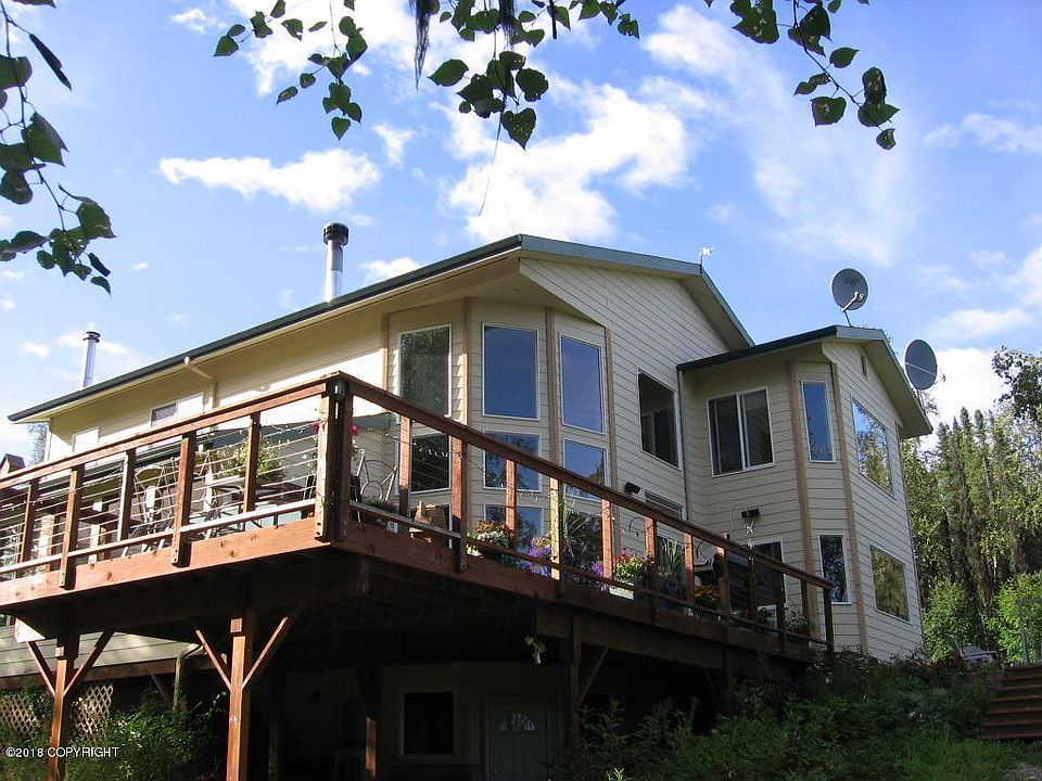 This amazing home is one of a kind! Built by long-time builder John Anderson as his personal residence, it has everything! On just under 5 acres, a rare find on Nancy Lake, this place is a dream home. Over 1,000sf of solid oak flooring, screened-in sun porch, greenhouse, chef's kitchen with a 9' maple butcher block island, & a living room with a fireplace & a 20' wall of floor-to-ceiling windows.The perfect kitchen, with a 9' x 4' island with solid maple butcher block countertop, all DeWills hickory cabinetry with 42" upper cabinets, lower cabinets with slide-out shelves, numerous storage drawers, and plentiful counter space with Travertine backsplash. There is a large walk-in pantry off the kitchen as well as a built-in kitchen desk. The custom kitchen anchors an area between the family room and the dining area. The dining area sits along a 5'x8' window with beautiful views of Nancy Lake and the Hatcher Pass mountains. The family room is cozy and comfortable, is wired for surround-sound speakers, has ample room for a sectional couch and seating, and plenty of wall space for the home theatre. (Note: there is an option for many of the furnishings and appliances to be included as part of the house sale). The main floor formal entry has an artic entryway that leads into a hallway with 2 coat closets. The formal living room has a wood-burning fireplace, and a 20' wall of floor-to-ceiling windows overlooking the lake. A doorway off the living room leads to the screened-in porch and greenhouse, both with knotty pine paneling and skylights. The main floor also features a guest bedroom, with its own private bath with custom-painted "Loon" tiles. A rear hallway leads to a combined laundry room/half-bath, and a mud room with lots of hangers, hooks and shelves for all those wet and snowy winter coats, hats, mittens, and boots. Off the rear hallway is an attached garage with in-floor heat and lots of built-in storage. The top floor has a master suite, with separate his and hers walk-in closets. The master bathroom has a custom walk-in tiled shower (with the "Big Dipper and North Star" inlaid in the floor tile) with a glass block window, a linen storage cabinet, and tile floor with in-floor heat. The top floor also features a 2nd large bedroom with a walk-in closet and its own bathroom with custom-painted "Forget-Me-Not" tiles. The top floor has a large open loft office area overlooking the living room and an amazing view of the lake. The office has a custom desk, lots of storage and file cabinets. This house includes a walk-out basement with a mother-in-law apartment, complete with a kitchen and full bath, in-floor heat, 2 storage rooms and a private entry. This has options of being an income producer, a B&B, or nanny quarters. Overlooking the lake is a large deck, and a concrete patio perfect for evening fires. Mature landscaping includes mountain ash, choke cherry and larch trees, as well as ample native spruce and birch trees. There is a large garden area with raised beds, and numerous flower beds around the house and garden area for perennials and annuals. There are nearly a dozen cedar birdhouses scattered about that nest lots of swallows that help keep the spring mosquitoes in check, and there is a first-class stairway down to the floating dock. This house includes a Ground-Source heat pump system for its main heat source with back-up oil furnace heat. This great home has a 5-Star Plus energy rating. On the property there is a large 900 sf garage/shop with an attached lean-to storage shed. There is also a free-standing 750 sf storage boat barn with ample space for snowmachines, tools, and other toys. The exterior of the home is hardi-plank siding, built to last through years of Alaskan winters.