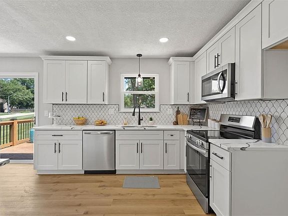 Multiple offers received. Please submit offers by 7-21-24 at 6pm. This remarkable 3 bed, 2 bath, move-in ready home has been beautifully remodeled inside and out. The abundant natural and recessed lighting in the kitchen and living room show off the white soft-close cabinets, quartz countertops, tasteful backsplash and stainless appliances. The dining area of this cheerful eat-in kitchen has a lovely view of a relaxing deck and expansive, conveniently fenced and flat backyard. On this home’s main level you have three bedrooms including the master with an ensuite bath, as well as a second full bath, each boasting exquisitely tiled showers and flooring. There’s so much to love with NEW windows, hot water heater, and durable wood-like luxury vinyl plank flooring that extends throughout both levels of the home and fresh, neutral-colored carpet to cozy up the bedrooms. Entertaining and family time is enjoyable with the daylight finished basement exiting to the 2-car garage and large corner lot with a flat new driveway, most appreciated with winter weather and toys that roll! Approx 13 X 16 outbuilding too. This incredible location in the highly-rated NKC school district including Staley High, along with nearby shopping & dining, as well as KCI airport and downtown KC within minutes puts this home at the TOP of your list! Don’t delay as this opportunity will pass quickly!
