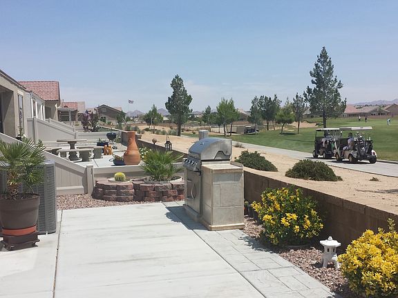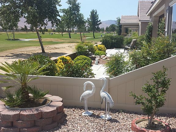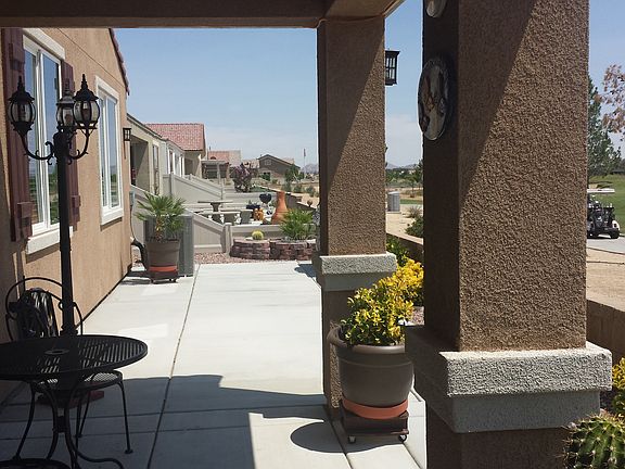 Senior community in Apple valley. Absolutely Beautiful Large Home, 2 bedroom, 2 bath, with a third room being used a office, all sitting on a beautiful Golf Course with over 2000 plus square feet. Custom Glass Front door, Matching granite counters and matching beautiful dark cabinets in both bathrooms and kitchen. Matching Stainless Steel appliances with a double oven and recessed lighting in kitchen. Large Granite Kitchen Island, with eating area as well as a formal dinning area. Inside laundry room with deep sink and matching dark wood cabinets. Custom ceiling fans in every room, Full window coverings. Plenty of storage and cabinet space through out home. Large Master Bedroom With Granite walk in shower. Extra Large walkin Closet in the master bedroom. Porcelin wood grain flooring throughout with exception of bathrooms. Custom Courtyard patio in front of home along with rock landscaping that is water efficient. This home also comes with a mini putting green and custom built pizza oven, barbeque island and Bar