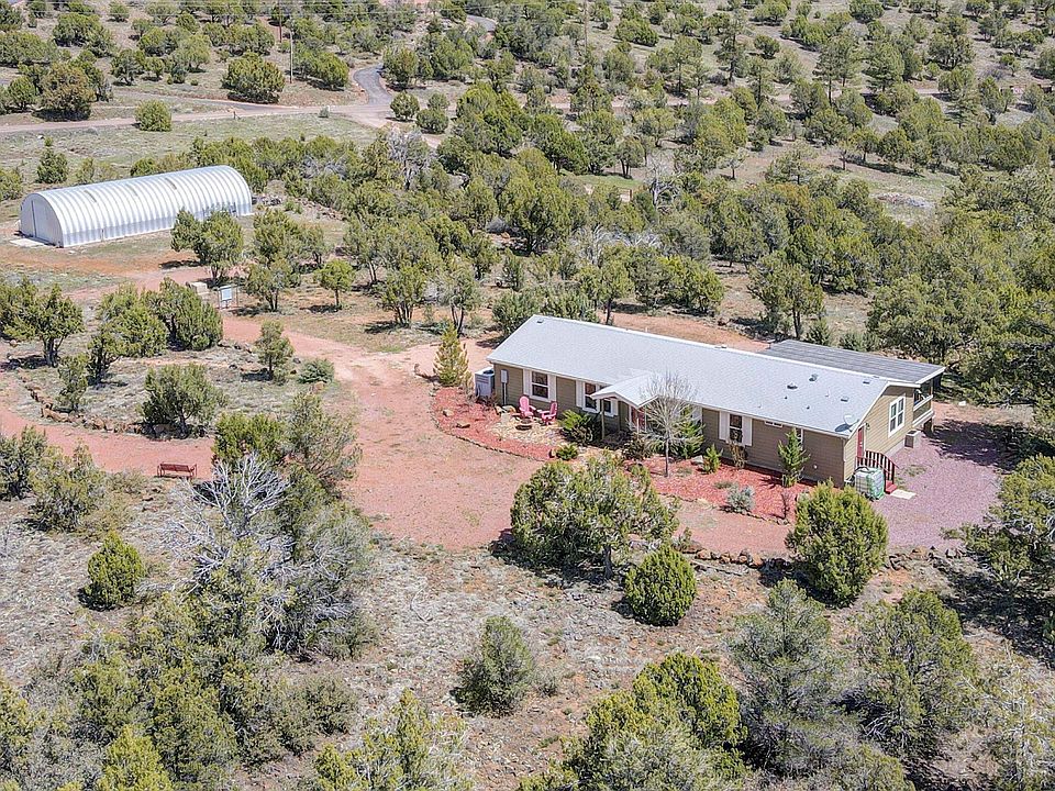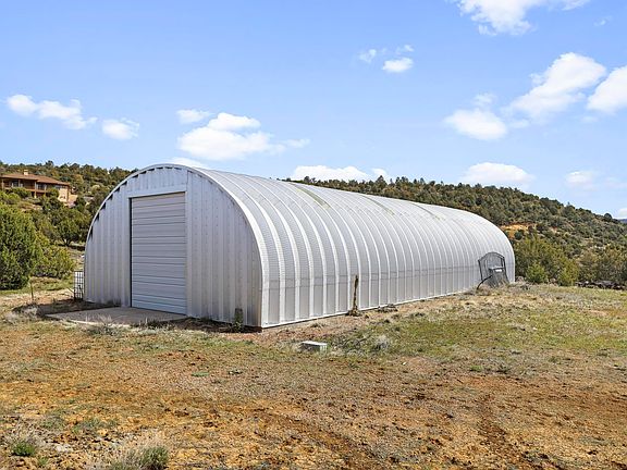 This country cottage and large hobby barn is set on 4.5 acres looking out to Strawberry Valley and the Mogollon Rim. The 1800 square foot manufactured home is designed for four season Arizona comfort. The home features sturdy 2 by 6 construction, R26 insulation, luxury vinyl planking, a water softener and a high efficiency heat pump for warm winters and cool summers. This ideal getaway has three bedrooms,2 full baths and a mud room with a separate entrance. A kitchen with induction stove and the great room with Starlink internet service leads to a covered porch for wildlife viewing. Down from the porch, there is a covered viewing deck with a fire pit to watch the moon rise over Strawberry Mountain. Gearheads and hobbyists can spend time in the separate 1800 square foot insulated Quonset style metal building sitting on a poured concrete slab. It is outfitted with electrical outlets ranging up to 50 amps and there are conduits for compressed air. Skylights provide excellent light during the day and industrial size lights flood the space at night. The covered 300 square foot porch looks east to the Rim. Home furnishings and equipment in metal building are negotiable for purchase by separate agreement.