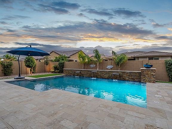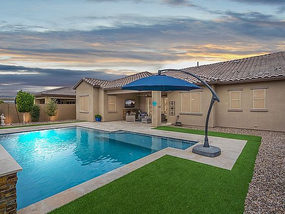 SHOWINGS WILL START FEB 5TH FROM 11-2PM! This home shows better than a model with 2 beds + den +2.5 baths! It has been meticulously maintained and cared for. The owners have spared no expense in upgrading this beautiful home! This is a super popular floor plan with some really smart structural changes, including adding an additional 5' X 8' pantry for storage, and an oversized laundry room with a desk! Throughout the home you will find rich, neutral hardwood floors, upgraded tile, lighting fixtures and ceiling fans. The large great room with 2 separate dining areas, a large gourmet kitchen, and living room is perfect for entertaining! It is light and bright and overlooks the spectacular backyard! The kitchen has been extensively upgraded with rich white cabinets and pull out drawers, granite countertops, tile backsplash, under cabinet lighting, stainless steel gas cooktop range, double ovens, and a custom kitchen sink, with "touch" faucet! The cozy eat-in area features a beautiful built-in dry bar, extensive cabinetry was also added to the laundry room and mudroom. All of the bathrooms have custom touches with tile surrounds in the showers, granite countertops, designer mirrors and fixtures.. The backyard is a showstopper with a gorgeous HEATED salt water pool, gas fireplace on the patio, artificial turf, travertine decking, and landscape lighting. The 22' X 27' garage is HUGE and features high end built in cabinets, and epoxy floors. Encore is a highly sought after active adult community located in the ever popular Eastmark. Just some of the amenities include a community pool and spa, fitness room, clubhouse, pickleball courts, and so much more! The location is wonderful! You have easy access to Loop 202, restaurants, shopping, and surrounding areas!