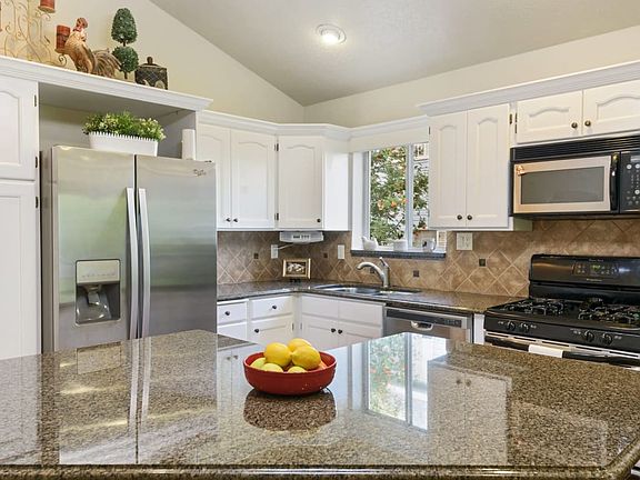 Stylish & immaculate home in desirable neighborhood. Main floor with vaulted ceilings. Kitchen: white cabinets/granite countertops/island. Hardwood floors & fireplace. Master suite has double sinks, shower & jetted tub, walk-in closet. Large bedroom with walk out to covered deck. Walk out covered patio to peaceful & relaxing natural back yard with trees/creek. A must see to appreciate all the great amenities.