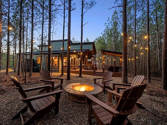 This 3-bedroom, 3-bathroom sanctuary offers private en-suites for every guest, featuring 2 King suites and a bunk room with 5 beds. Step onto the welcoming front porch, embracing panoramic views of the National Forest and Kiamichi/Ouachita mountains. Inside, an inviting open-plan living area boasts expansive windows framing the natural beauty, complemented by a towering stone fireplace for cozy evenings. The spacious kitchen and dining area provide a perfect setting for shared meals and entertainment after lake adventures or forest explorations.