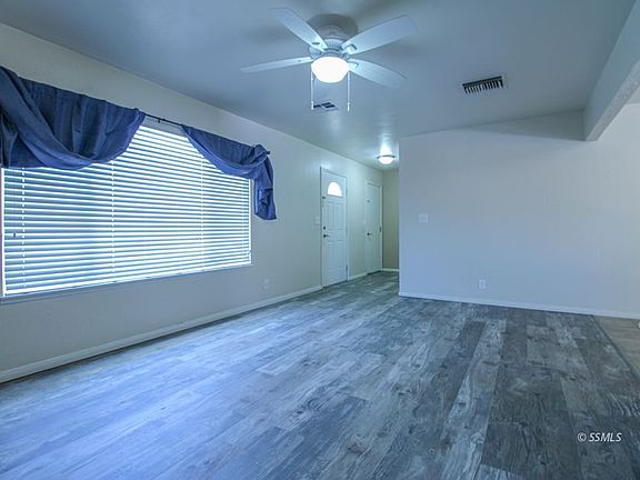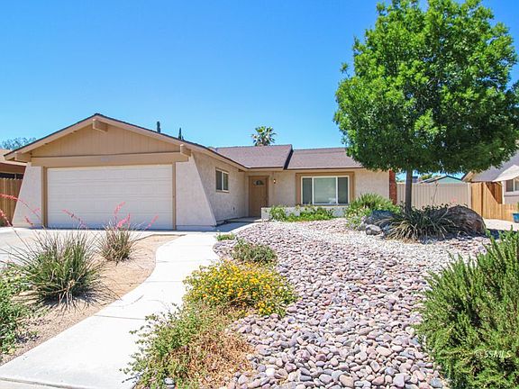 Beautifully landscaped front and back yards are just the beginning to this great home. Low maintenance front yard and welcoming entryway lead you to this truly unique home. New wood laminate flooring invites you to the large living room with white brick fireplace and custom shelving. Kitchen features enticing granite countertops, a farm house sink (with lovely window view) complimented with beautiful white cabinetry. Joining the kitchen is a spacious dining room with access to rear patio. Two guest bedrooms are carpeted and have ceiling fans. Large master bedroom with long window for natural lighting and spacious walk-in closet. Newer vanities in both bathrooms. To escape the warm summer days, the home has both central air and evaporative cooling. The covered back porch has tiled flooring with ceiling fans, perfect for outside enjoyment. Backyard has a lush, healthy green lawn with wonderful olive, lemon and orange trees. There is also garden boxes loaded with produce, as well as a finished fort/shed with power. Side yard RV gate with space for plenty of parking. Finished garage with storage space and window for extra light. A truly beautiful home in Ridgecrest!