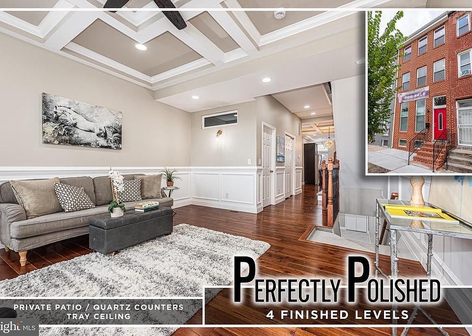 EXTRAORDINARY HOLLINS MARKET RENOVATION 4 FINISHED LEVELS OF LIVING SPACE! Open floor plan featuring a spacious living room with coffered ceiling wainscoting, gourmet Chef's kitchen with Quartz counters, ss appliances, a main level half bath, 2nd level with 2 bedrooms, 1 full bath, and desirable bedroom level laundry, a 3rd level Primary suite with vaulted ceiling, walk-in closet and a spa bath with double sinks a walk-in shower, a finished basement with a family room, 4th bedroom, and 3rd full bath, zoned heating and air, and a large private patio! Property is eligible for 10k Vacants to Value grant! Conveniently located close to downtown Baltimore, UMMC, stadiums, and major roadways!