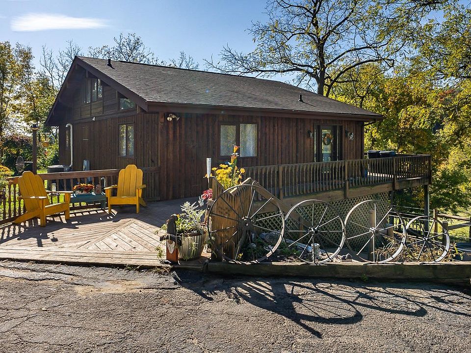 Welcome to an incredible home that perfectly embodies that charming rustic country feel, resting on 18.47-acre property nestled in the serene Jo Daviess County, just a short drive from Galena IL. Situated between Apple Canyon Lake and The Galena Territory, this spot is prime real estate. This beauty includes 5 bedrooms and 3 baths, adorned with ample windows that offer picturesque views of the valleys. Recently updated kitchen and two bathrooms, complete with fresh flooring throughout the entire house. Enjoy lounging on the extensive wrap-around deck or cozying up in the living room by the crackling wood-burning fireplace. Downstairs, discover a versatile workshop/mudroom area, complete with its own bathroom. Additionally, there's a 35' x 60' Steel Utility building with large overhead doors, concrete floors in three-quarters of the space, water, electricity, a workshop, and two horse stalls. The land encompasses a spacious fenced pasture, wooded areas adorned with stunning rock outcroppings, and an abundance of wildlife. This is a place that perfectly blends country living with modern comforts—a true sanctuary for anyone seeking peace and natural beauty. Additional 20.53 adjoining acres available for purchase MLS Number 202400605 Broker owned.