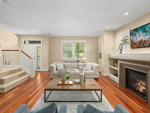 Renaissance At Peterkort Woods premium end unit townhome with an abundance of natural light, and masterful craftsmanship. An inviting first impression is provided by the main level's hardwood floors. The living room features a gas fireplace for intimate conversations, complemented by thoughtfully integrated built-ins and windows that bathe the space in natural light. The kitchen showcases stainless steel appliances, slab granite countertops, and a gas cooktop for a seamless cooking experience. Retreat to the primary suite complete with an en-suite bathroom featuring a walk-in closet, a soothing soaking tub, and a separate walk-in shower. The lower-level media room offers a versatile space for gatherings with friends whether it's watching the big game or creating a home theater experience. Notably, it also includes a spacious two-car garage and enjoys the benefits of Washington County taxes. The location of this home embraces the charm and hospitality of a village within the city. Immerse yourself in a tranquil atmosphere, enveloped by the beauty of nature, while enjoying access to the community pool and clubhouse where social gatherings become cherished memories. NIKE, Intel, Providence Hospital, MAX Light Rail, and shopping destinations are all within close proximity.