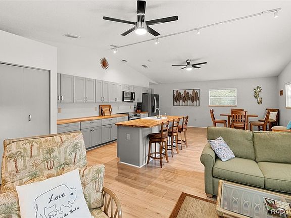 SWEET LITTLE HOME O’ MINE…This clean and comfy 2 BD/ 2 BA, 1408sqft home sits comfortably on 1.25 acres, amongst all the peace, quiet and beauty that Florida has to offer. Beautifully maintained and pride in ownership emanates throughout. A freshly painted interior w/ a vaulted ceiling and luxury vinyl planking grab your attention upon entry to the large, open family area that is perfect for entertaining and keeping everyone connected to food, conversation and good times. The dual paned and double hung windows allow the light and warmth of the Florida sun in, unless you draw the NEW blinds closed. The updated kitchen features plenty of gray shaker cabinets with butcher block countertops, NEW stainless-steel appliances, center island with breakfast bar and pantry closet. Living and dining rooms are all within earshot, where family can gather around and share their past adventures or create new precious memories. An amazing RARE FIND, with double master bedrooms w/ ensuites, walk in closets and separate, private entrances. A floorplan that family, friends and roommates can appreciate! Tankless hot water heater and Blink doorbell/camera system with audio and video are a plus! Sitting out on the side patio is a treat where you can admire the freshly painted exterior and NEW leaders & gutters. You can contemplate some creative ideas for the outdoor space, which is a clean palette. Shed for extra storage and plenty of room to park your cars, boats, or ATVs in the fully fenced backyard; so, BRING ALL YOUR TOYS! NO FLOOD ZONE! NO HOA & NO DEED RESTRICTIONS! Perfectly located! Only 45 minutes from Cedar Key to the west for birdwatching and nature walks and Crystal River to the south for fishing, kayaking and swimming with the manatees! Furnishings are Negotiable! FREE 1 yr. HOME WARRANTY for PEACE of MIND is OFFERED to the BUYER!