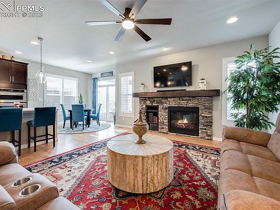 Gorgeous ranch style home with AMAZING Pikes Peak views!*Beautiful Cordera neighborhood* Professionally landscaped to include attractive and easy maintenance artificial turf that looks great all year long, trees and shrubs * Gourmet kitchen with large quartz island and eating bar, Double oven, gas cooktop, microwave, sizable pantry, pendant lights* The kitchen nook invites the incredible view of Pikes Peak to join you for coffee* Hardwood floors* A fabulous open floor plan that flows comfortably between the living room, kitchen, nook and dining room* Luxurious main level Master bedroom with a private 5 piece Master bath* Master closet has cedar flooring * A second bedroom and full bath are also on the main level* Convenient and ample sized laundry room on the main level with storage cabinets and washer and dryer included!* The fully finished basement offers a large area for a pool table or game table as well as a large TV area and wet bar with refrigerator* 2 nice sized bedrooms and a 3/4 bath in the basement as well* Storage area with shelving* Radon mitigation system already installed* Device charging station in the kitchen* Covered back deck with privacy and sun shades and natural gas for a BBQ* A welcoming covered front porch* Spacious and oversized 3 car garage with tandem parking for a small 4th car, motorcycle, bikes, workshop etc* The Cordera community offers trails, parks and clubhouse, fitness facilities and a pool* This is a wonderful location and community! Main level living at it's very best. A quality home built by Campbell Homes* You must see this home!