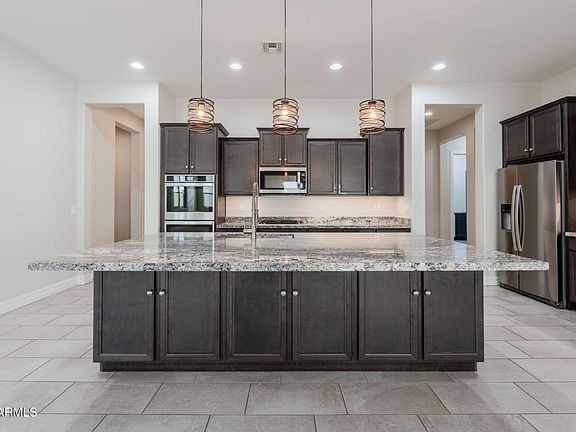 Additional highlights: instant hot water throughout the home, pre-wired TV/audio in multiple rooms and the back patio, a 3-car garage with double and single bays, overhead storage racks, attic flooring for extra storage, a new AC condenser, and double-locking gates to the pool area per Mesa city code. Enjoy stunning curb appeal with beautifully landscaped front yard and low-maintenance synthetic grass in the back, all while being situated across from a greenbelt.